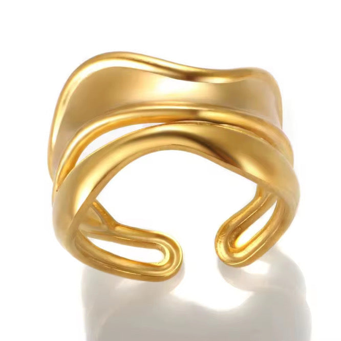 The Aurelia Wave Ring features fluid, intertwining curves that capture the effortless movement of golden waves. Its open, sculptural design makes it both bold and feminine, while the adjustable fit ensures comfort for any finger. Crafted in 18k gold plating, this one-size ring is water-resistant and tarnish-resistant—an elegant statement piece that adds modern artistry to any look.