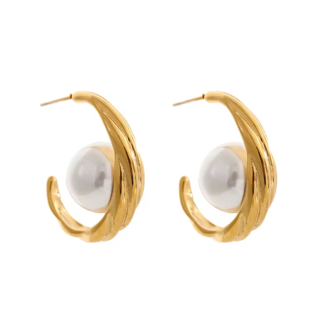 A queen-worthy take on the classic pearl. Sculpted, high-shine gold curves embrace a luminous pearl centerpiece, creating a silhouette that feels both regal and modern. Bold yet refined, these hoops frame the face beautifully and instantly elevate everything from structured blazers to effortless everyday looks.