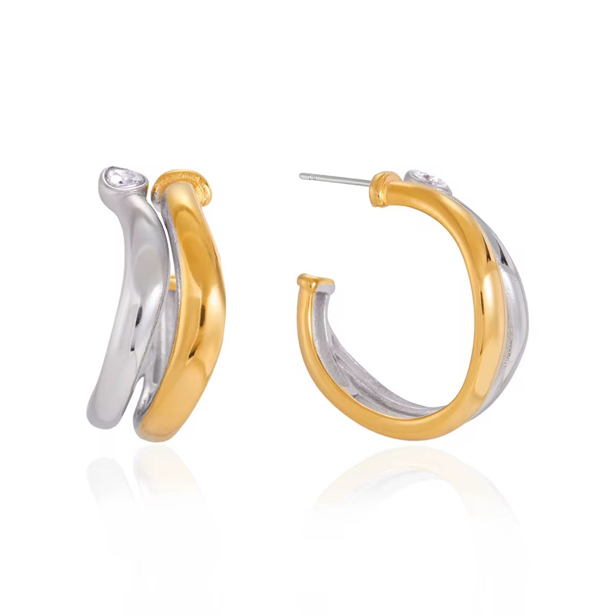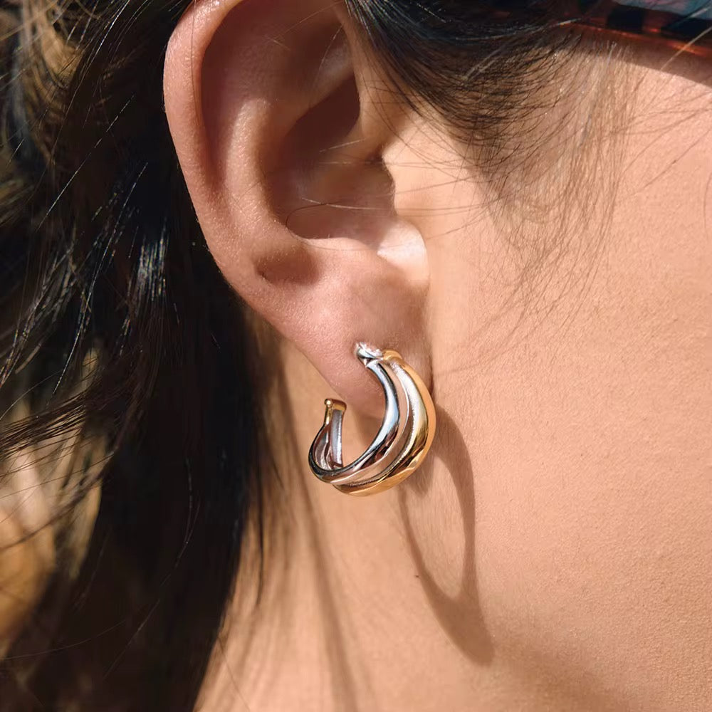 Gold or silver? Why choose. These bold, sculpted two-tone hoops are made for the woman who doesn’t follow the rules — she sets them. With fluid curves and a modern mixed-metal design, they instantly elevate everything from denim to date night. Statement-worthy, effortless, unforgettable.