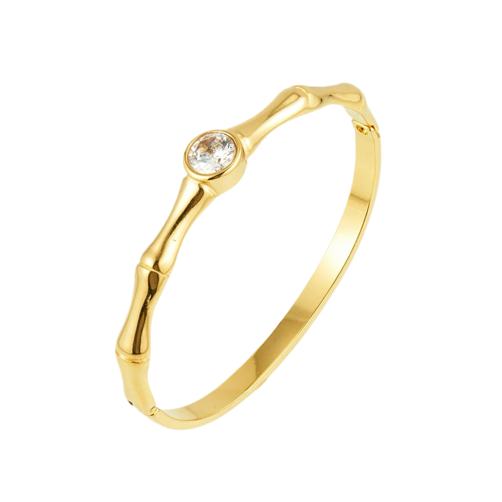 The Zenia Bamboo Bracelet is an elegant blend of nature-inspired design and timeless luxury. Crafted from durable stainless steel with an 18K gold-plated finish, this bracelet features a bamboo-inspired structure with an organic, textured look. A sparkling zircon stone serves as the centerpiece, adding a radiant touch to its minimalist aesthetic. Waterproof and versatile, the Zenia Bamboo Bracelet is perfect for both casual wear and special occasions, making it a standout addition to any jewelry collection.